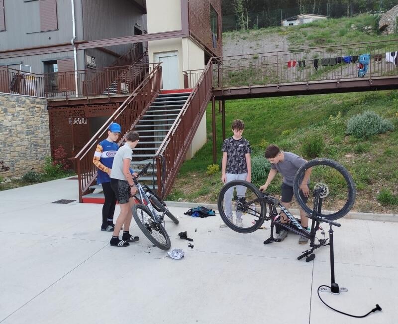 En fin d’après midi, au retour de la journée de VTT un temps était consacré à l’entretien du vélo et aux réparations des incidents mécaniques de la journée.